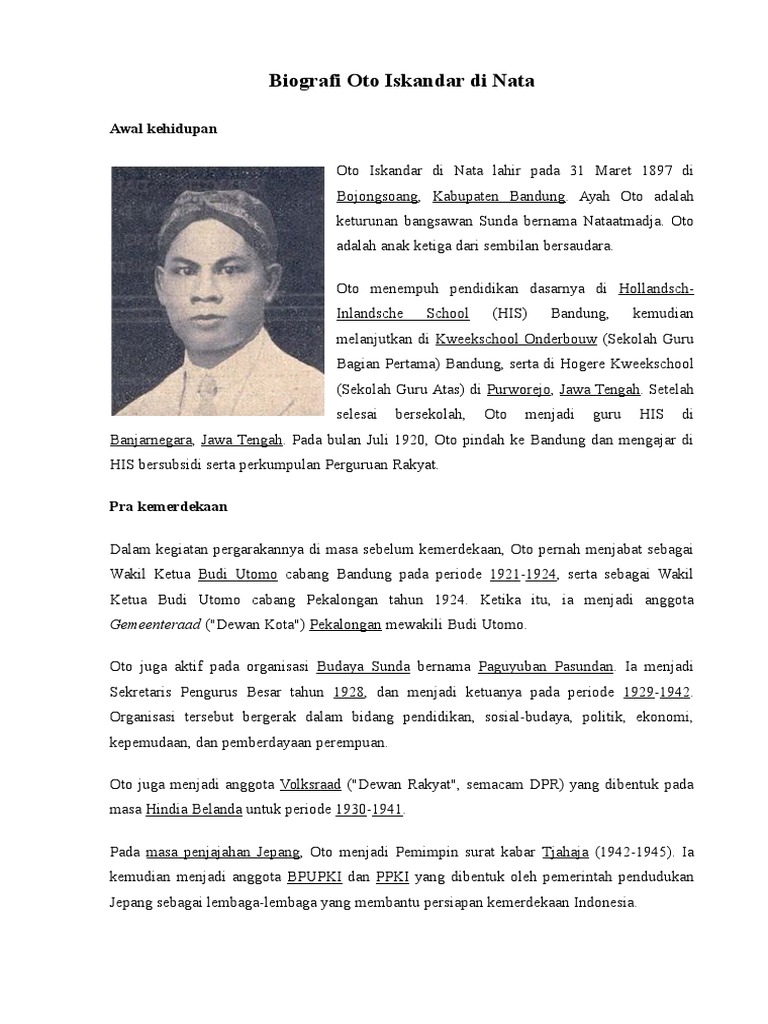 Pada 31 maret 1897, raden. Oto iskandar dinata jadi pahlawan nasional dumasar kana surat kaputusan presiden republik indonesia no. Biografi otto iskandar dinata a. Oto iskandar di nata adalah pejuang kemerdekaan yang lahir di bandung 31 maret 1897. Sukarno dipilih menjadi presiden dan drs. Otto adalah anak ketiga dari sembilan bersaudara. Oto iskandar dinata merupakan salah satu pahlawan nasional asal jawa barat. Kembali lagi sebuah contoh dari biografi bahasa sunda, yang merupakan salah satu contoh biodata atau biografi pahlawan jawa barat dalam bahasa sunda, tentang oto iskandar dinata, yang merupakan salah satu tokoh sunda terkenal yang berasal dari jawa barat. Ia merupakan pejuang yang gagah berani dan gigih membela bangsa indonesia.