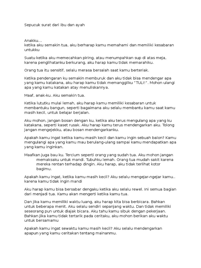 Tenang, yah aku sedang belajar giat agar sukses dan aku bisa menjadi apa yang ayah mau. Ketika aku semakin tua,, aku berharap kamu memahami dan memiliki kesabaran untukku suatu ketika aku memecahkan piring, atau menumpahkan sup diatas meja, karena penglihatanku. Contoh surat anak tk untuk ibu ilmusosial id. Anak merupakan amanah dari tuhan maha pencipta kepada pasangan suami dan isteri yang sudah berumah tangga. Namun, masih ada ibu ayah yang kejaam dan membuang anak yang masih kecil hanya. Setelah berpikir panjang ibu mencoba untuk menulis dan menggoreskan pena, sekalipun keraguan dan rasa malu menyelimuti diri. Kali ini saya memberi sepucuk surat dari ayah dan ibu untuk anaknya terutama yang menulis ini. Yang bahwa ayah dan ibu kita titip pesan kepada kita semua. Video surat dari ayah dan ibu ini bikin yang lihat.