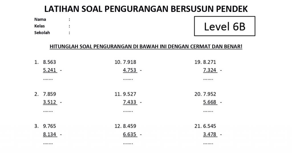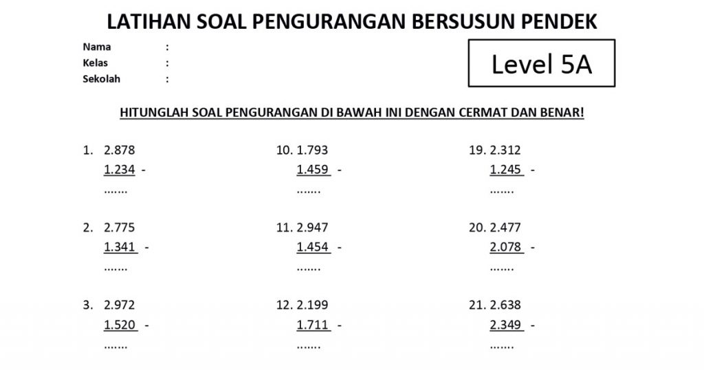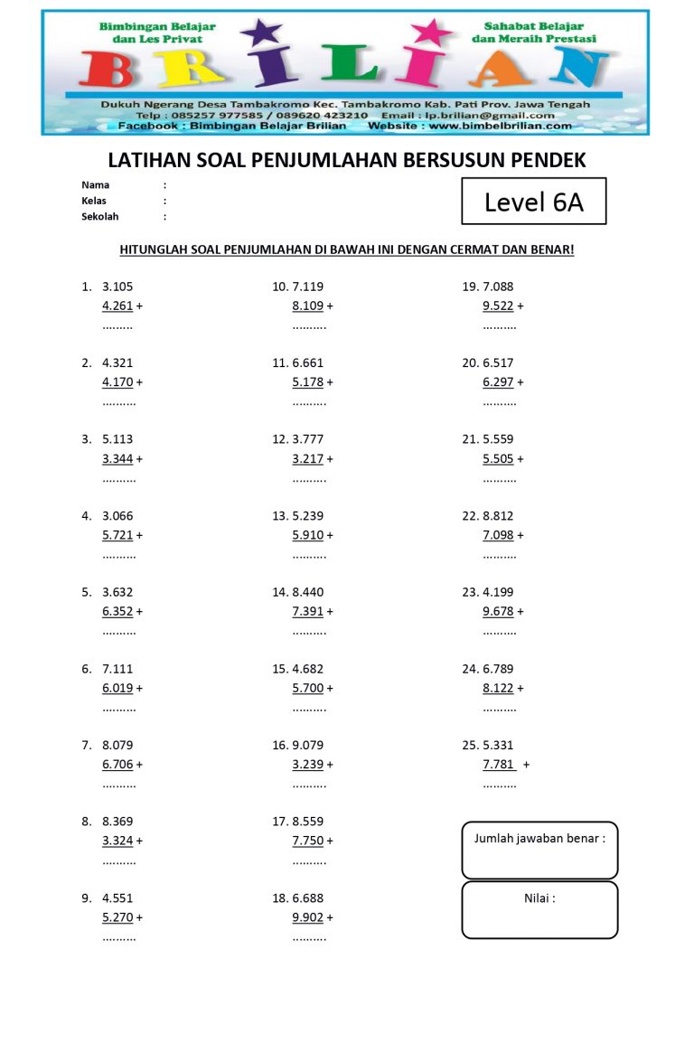 Assalaamu alaikum sahabat gurukatro, sebenarnya operasi hitung pengurangan bilangan bulat tergolong proses yang sangat mudah dikerjakan. Latihan soal penjumlahan kelas 1a by iirkelas1a: Pengurangan (tanpa meminjam) contoh soal: 11 pemecahan masalah agar supaya siswa mau belajar contoh soal matematika kelas 1 sd semester 2 penjumlahan dan pengurangan utamanya pelajaran matematika. Tautan download, level selanjutnya yaitu level 3 sampai 7, serta soal versi online juga tersedia. Setiap variasi soalnya terdapat dalam 1 lembar kertas ukuran a4. Seorang pedagang mempunyai beras sebanyak 4125 kg dan beras tersebut terjual sebanyak 3025 kg. Pembagian bersusun pendek 3 angka. Untuk lebih jelasnya, simak contoh soal berikut ini.