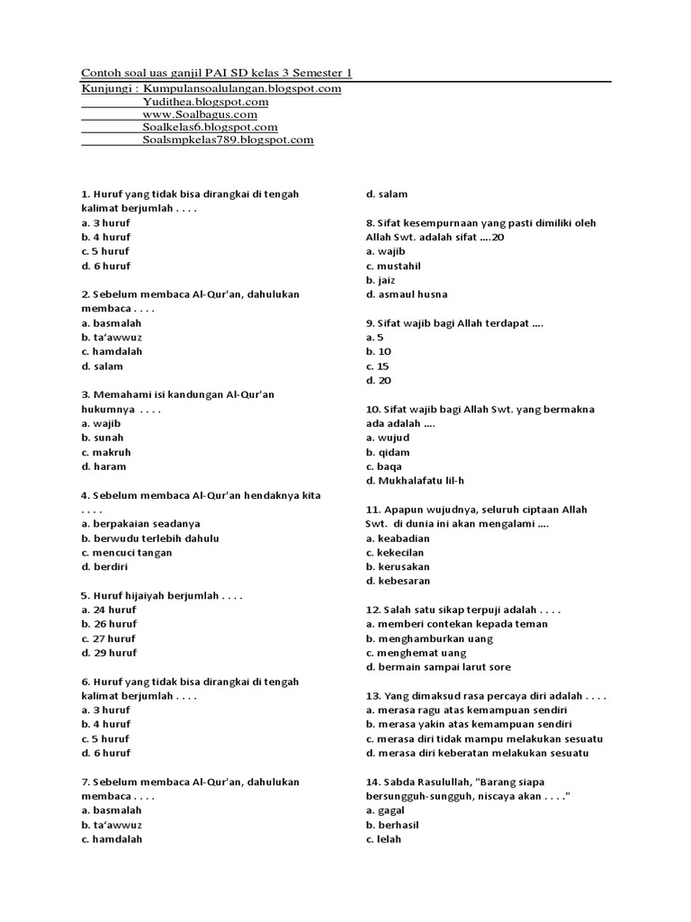 Tidak berupa soal saja file dokumennya juga dilengkapi dengan kunci jawaban. Tak hanya khusus untuk pelajaran tematik saja, soal matematika kelas 6 juga ada di sini. Download soal pts / uts pai dan budi pekerti kelas 6 k13 tahun 2019/2020. Soal ulangan atau penilaian akhir semester 1 mata pelajaran pendidikan agama islam dan budi pekerti (pai dan bp) kelas 1, 2, 3, 4, 5, dan 6 Soal pas pai kelas 6 tahun pelajaran 2021/2022 format pdf semester 1. Posted in umum tagged kisi kisi soal pai kelas 6, soal agama islam kelas 6 kurikulum 2013, soal anak kelas enam semester satu mid pai, soal pai kelas 6 bab 3, soal pai kelas 6 tentang al kafirun, soal tentang surat al kafirun kelas 6, soal uas pai kelas 6 semester 1 kurikulum 2013 revisi 2018, soal ujian sekolah agama islam sd kelas 6, soal. Selain membagikan soal uas/pas mapel pai kelas 6 sd semester 1 (ganjil) tahun. Oke, untuk membantu sobat guru pai alias guru agama islam, gurupenyemangat.com telah menyiapkan dokumen soal ujian akhir semester pai sd kelas 6 semester 1 kurikulum 2013 tahun 2021 berformat doc (word) lengkap dengan kunci jawabannya. Adapun pembahasan pai untuk kelas 6 adalah sebagai berikut :
