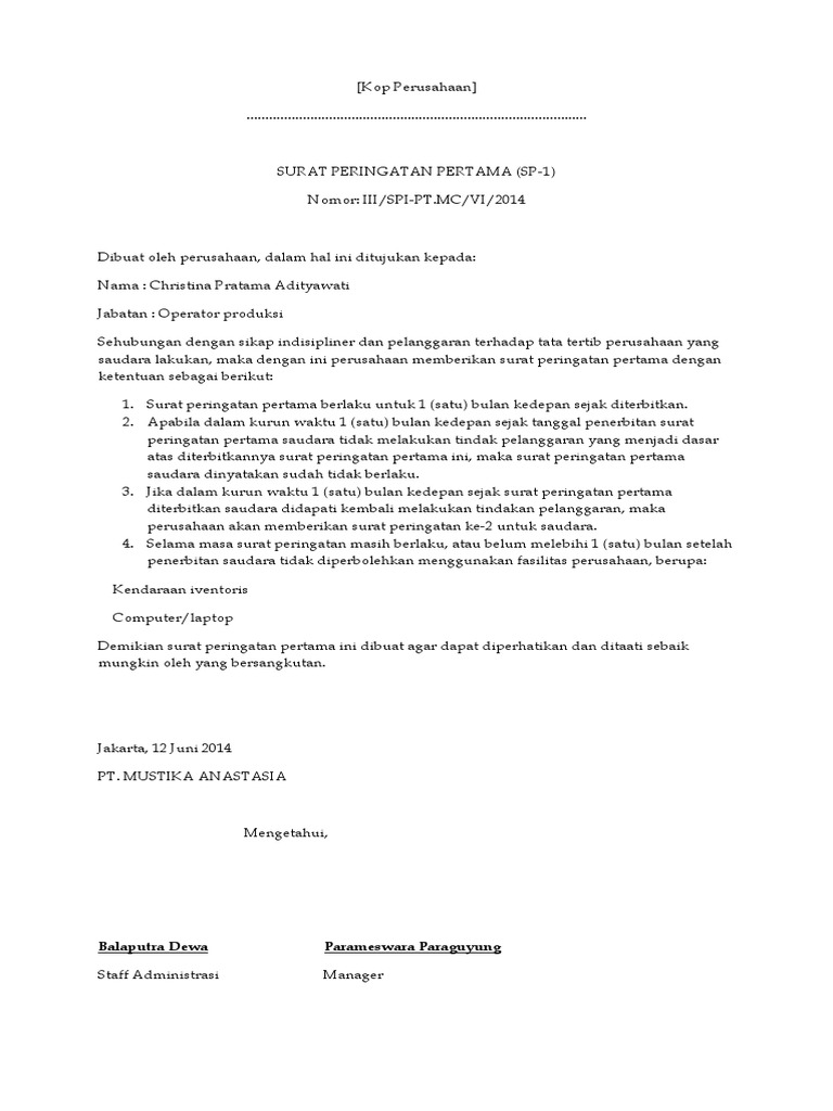 Kalau sp diterbitkan secara berurutan, sp 1 berlaku untuk jangka waktu 6 bulan. Jika karyawan melakukan kembali pelanggaran dalam masa tersebut, maka pengusaha dapat menerbitkan sp 2 dengan jangka waktu 6 bulan. Download contoh surat peringatan yang benar format 1653 x 2339 pixel. Download 5 contoh surat peringatan 2 untuk karyawan perusahaan. Nah, diatas adalah contoh surat peringatan karyawan, surat peringat kerja, contoh surat sp 1, 2, 3 untuk bisa digunakan. Bilamana anda belum mengetahui penulisannya dan ingin menulis, maka artikel ini dapat membantu proses penulisan anda. Doc contoh surat peringatan sentot e baskoro academiaedu. Peringatan tertulis ii kedua 4. Surat peringatan sp karyawan dan ketentuannya menurut uu.
