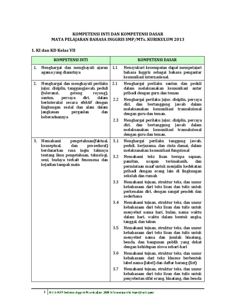 Setiap pengembangan dan penyempurnaan sebuah kurikulum pada dasarnya berpedoman pada. Ki dan kd bahasa inggris kelas 7 8 9 smp mts kurikulum 2013 ini dapat menjadi pedoman bagi guru dalam menyusun perangkat pembelajaran. Memiliki kesadaran tentang hakikat dan pentingnya bahasa inggris untuk Ki dan kd jenjang sd mi kurikulum 2013 ini dapat menjadi pedoman bagi guru dalam menyusun perangkat pembelajaran tahun pelajaran 2021/2022. Ki dan kd bahasa inggris sd kurikulum 2013 revisi 2019. Materi tematik kelas 4 sd kurikulum 2013 edisi revisi 2018 terbagi dalam 9 (sembilan) tema sebagai berikut. Untuk mempermudah guru dalam melakukan penilaian hasil belajar peserta didik. Berikut ini kami sampaikan materi posting tentang kompetensi inti (ki) dan kompetensi dasar (kd) untuk mata pelajaran bahasa inggris sekolah dasar (sd)/ sekolah madrasah ibtidaiyah (mi) kelas i s.d. Hal ini dikarenakan hal tersebut merupakan dasar bagi para guru dalam mengajar.